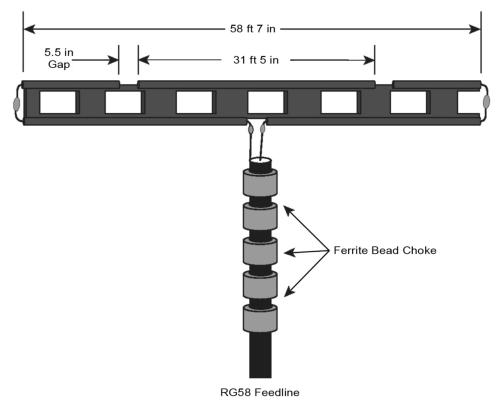 31 feet 6 inches long with a 2.5 inch gap, and then made the overall length of the antenna 60 feet long. That overall length